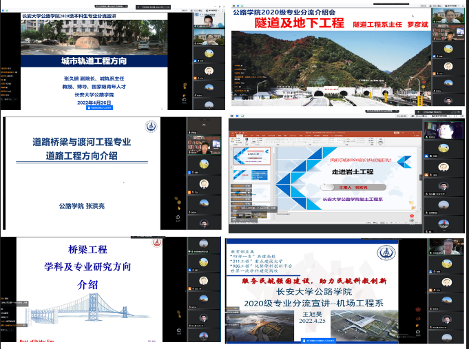 2022年4月26日21:00,学院在线上召开了2020级道路桥梁与渡河工程专业(方向)分流宣讲会。学院副院长、城市轨道工程系主任张久鹏,隧道工程系主任罗彦斌,道路工程系副主任张洪亮,岩土工程系副主任张宏光,桥梁工程系副主任陈峰,机场工程系副主任王旭昊参加会议,并作专业(方向)宣讲。2020级部分学生家长、教务工作人员、辅导员、道路桥梁与渡河工程专业学生530余人参会,会议由专业建设及教学主管张晔主持。