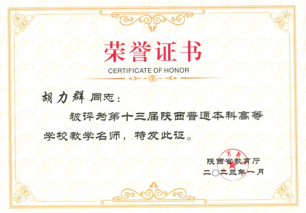 道路系胡力群教授荣获第十三届陕西普通高等学校教学名师奖。