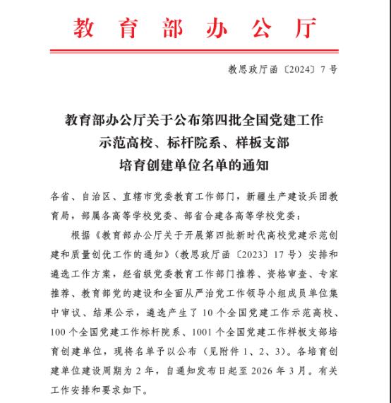 4月16日,教育部思想政治工作司发布《教育部办公厅关于公布第四批全国党建工作示范高校、标杆院系、样板支部培育创建单位名单的通知》(教思政厅函〔2024〕7号),经省级党委教育工作部门推荐、资格审查、专家推荐、教育部党的建设和全面从严治党工作领导小组成员单位集中审议、结果公示,遴选产生了10个全国党建工作示范高校、100个全国党建工作标杆院系、1001个全国党建工作样板支部培育创建单位。色情游戏
