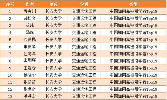 交通运输工程学科高被引学者Top1%