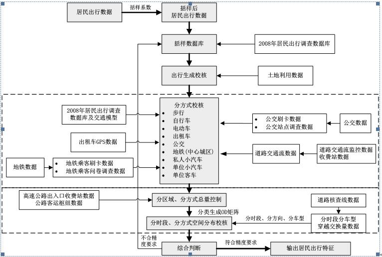 (1)数据扩样和综合调校技术。调查样本数据在较高抽样率和严密的样本质量控制情况下,可以代表总体的部分特征,但由于调查工作本身的复杂性、样本抽样的伪随机性、居民填表的失真性,样本数据会与总体情况产生一定程度的偏差。需要先将样本数据放大到总体数据,然后针对扩样后的总体数据结合其他辅助调查数据进行综合的调整与校核,进而在一定程度上消除偏差。