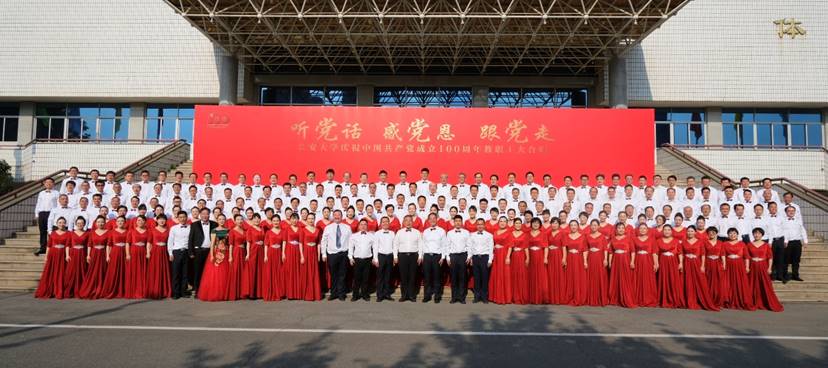 教师在院长陈建勋、院党委书记汪海年的带领下,由院党委副书记刘徐、院工会副主席路西利共同组织,选取了能表达全院教师心声的“没有共产党就没有新中国”、“不忘初心”两首歌曲,致敬我们党团结带领中国人民不懈奋斗的光辉历程、伟大贡献和历史启示,也深刻铭记“中国共产党人的初心和使命,就是为中国人民谋幸福,为中华民族谋复兴。”